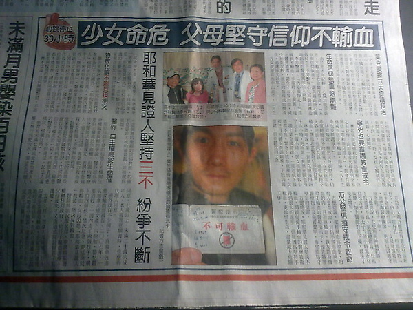 4.反对输血(甚至情愿死亡)。1994年4月8日,一批耶和华见证人的成员以违反教义为理由极力阻止一名需要输血以延续生命的女童(来自吉隆坡安邦村)接受输血导致女童最终死亡。此事可见于那日的《南洋商报》。